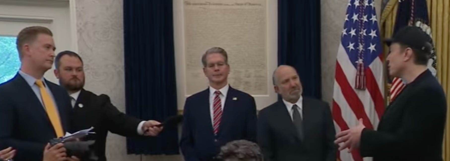 During most of his appearance with Trump in the Oval Office, Musk stood silently sporting a black cap, t-shirt and jacket. He looked like a second base Little League umpire who had a tough call to make. Trump who sat at the Resolute Desk in the Oval Office, presented him with a gold key and thanked him for his service to government.