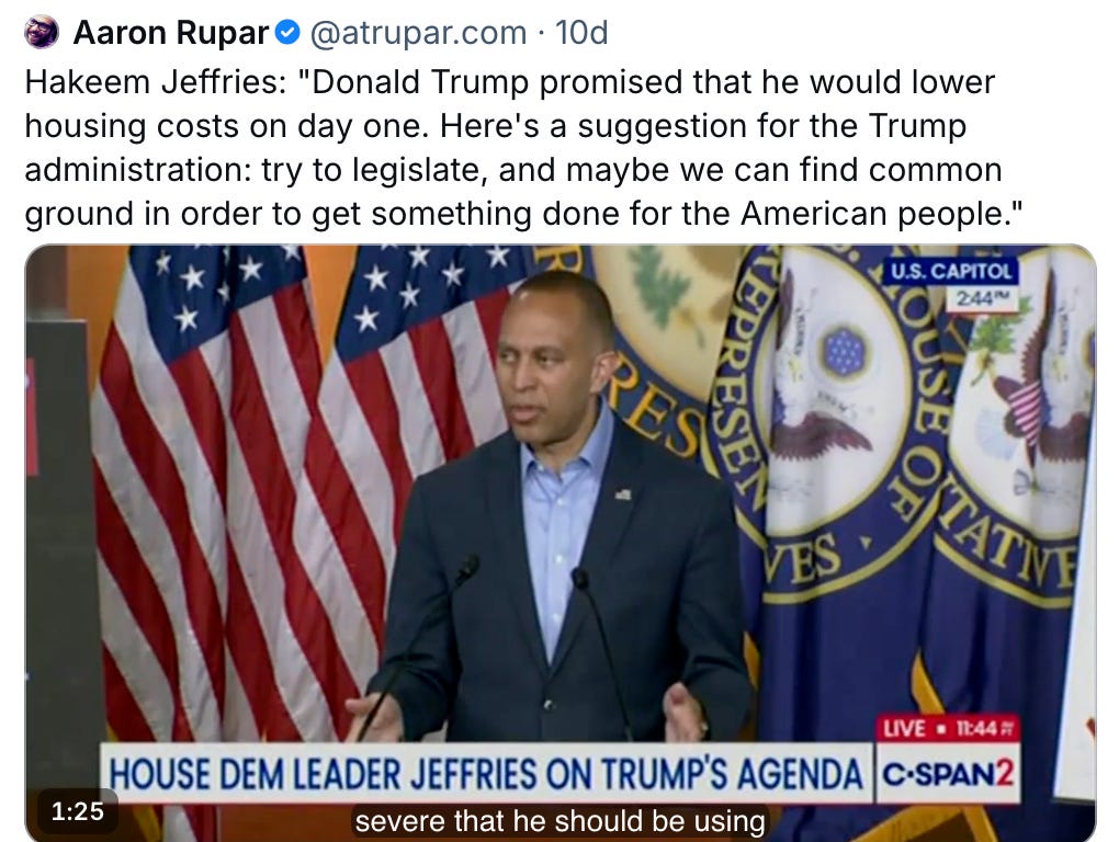 Jeffries responded two weeks ago to a Trump presser by talking about working with him on making housing more affordable, if Trump was willing.