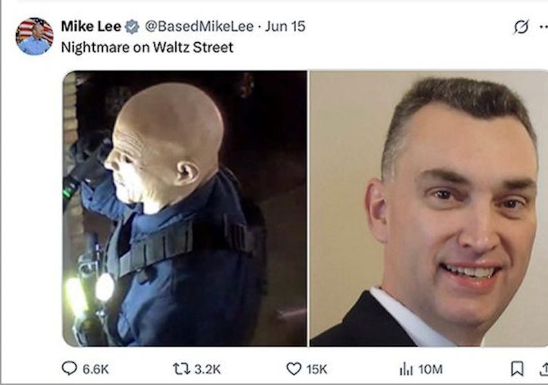So, GOP Senator Mike Lee can make a joke about the political murder of Minnesota Democratic State House Speaker, Melissa Hortman, and the attempted murder of St. Senator John Hoffmann. Both shot by the same deranged shitheel on the same night.