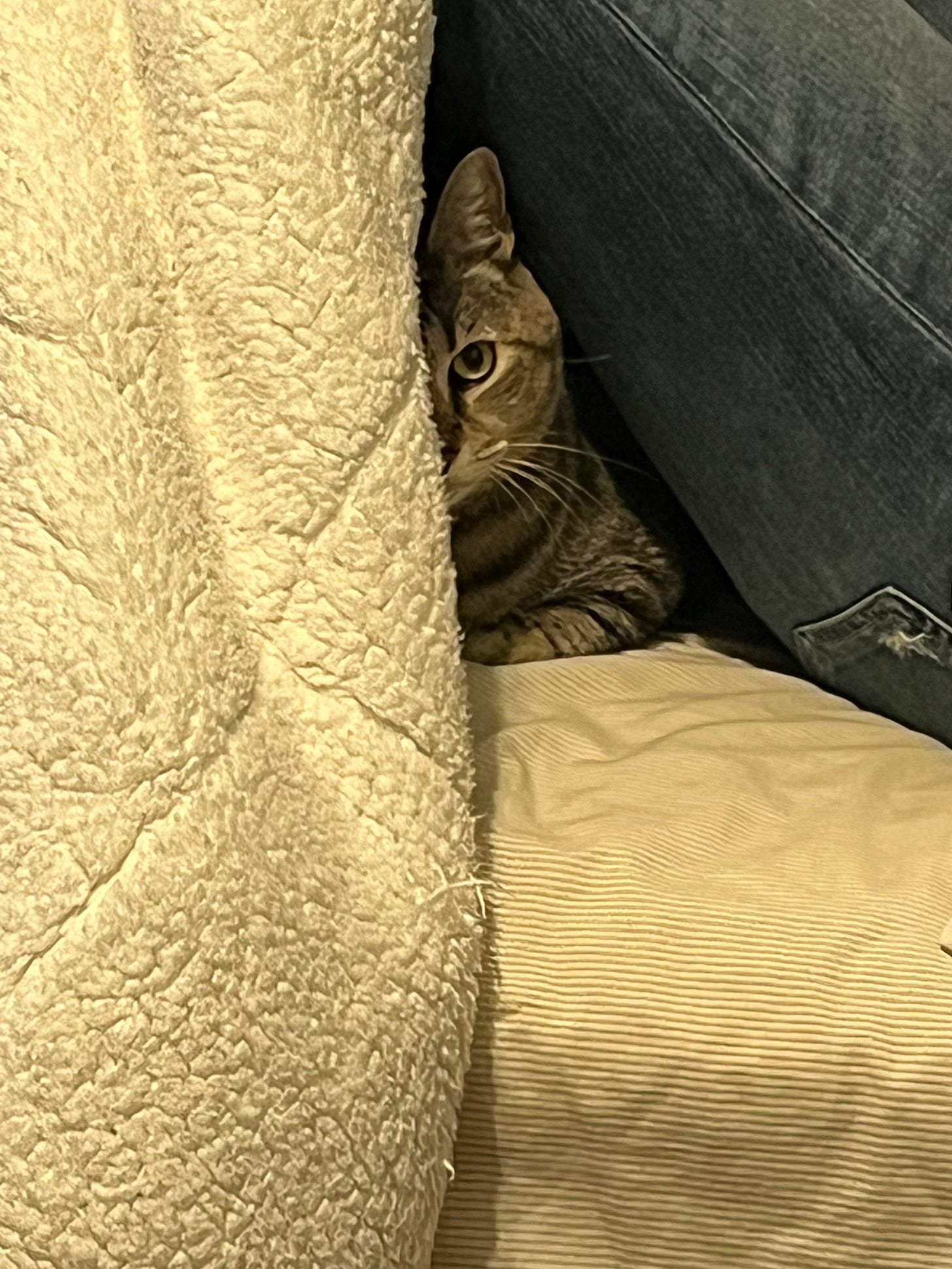 Quick kitty break! It’s adorable Stella, peaking out from her crafty hiding spot!