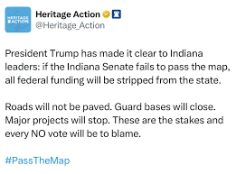 Lawrence followed with something far darker—and scarier: The Heritage Foundation openly threatening the entire state of Indiana after Republicans there refused to ram through extreme-gerrymandered maps. Roads, funding, military bases—basically a mob boss ransom note, but on really pretty letterhead. It was a sobering reminder that authoritarianism doesn’t always whisper. These days it tweets.