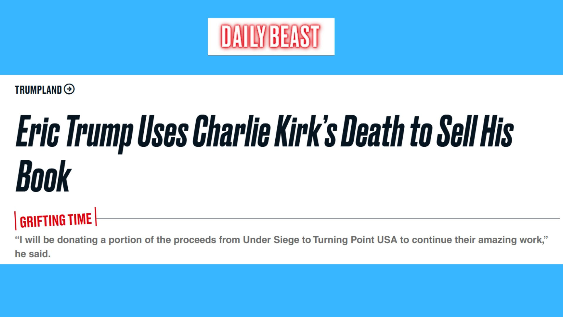 Relatedly, there is Eric Trump’s performative morality. Recently, Eric pledged to donate proceeds from his memoir to Turning Point USA, in the wake of Charlie Kirk’s assassination.