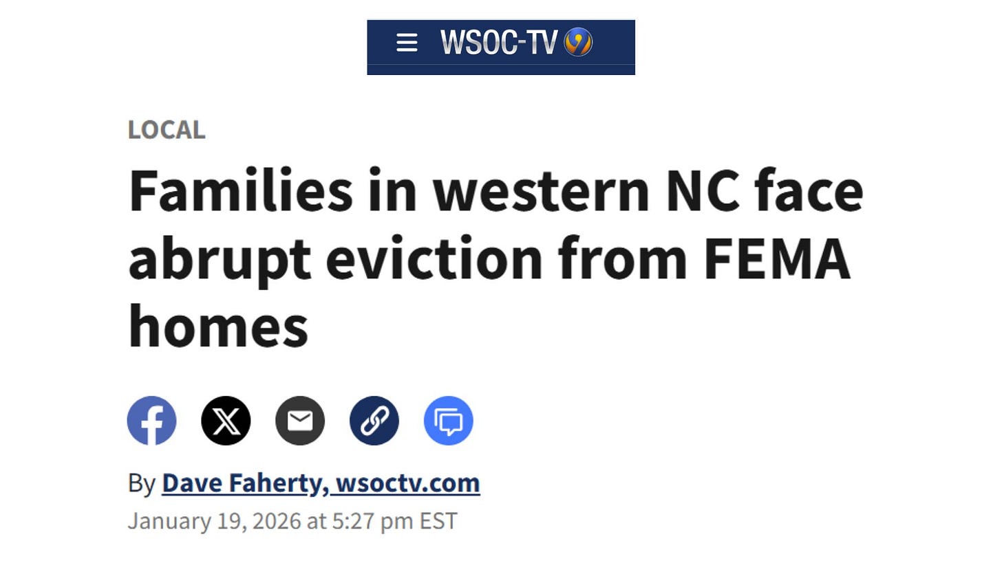 Consider North Carolina, where the wounds from 2024’s Hurricane Helene remain fresh. According to multiple local reports, FEMA evicted residents from temporary housing earlier than promised—some as recently as this week—despite these residents having nowhere else to go.