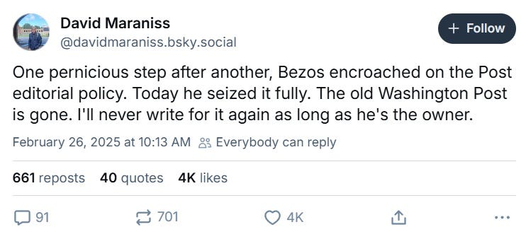 Both the Washington Post Opinions Editor, David Shipley, and Associate Editor, David Maraniss resigned immediately. Maraniss had worked at the Post for more than four decades.