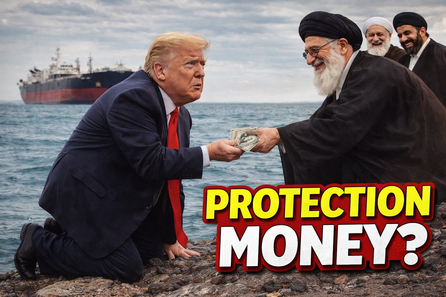 Is Donald Trump effectively paying Iran Protection Money in the Strait of Hormuz? Bowing down like he owns a jewelry or coat business on the corner of Delancey and Ridge and Meyer Lansky or John Gotti just came swashbuckling in to remind him how kerosene and fire interact?