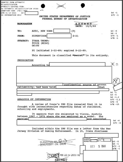 “A review of Ivana’s INS file revealed that it is fraught with inconsistencies regarding dates of residence, schooling and employment. It appears that she emigrated to Vienna, Austria...where she was employed as a model. Nowhere else in her INS file is there any indication of ever having attended Charles University.” - The Federal Bureau of Investigation, 1989