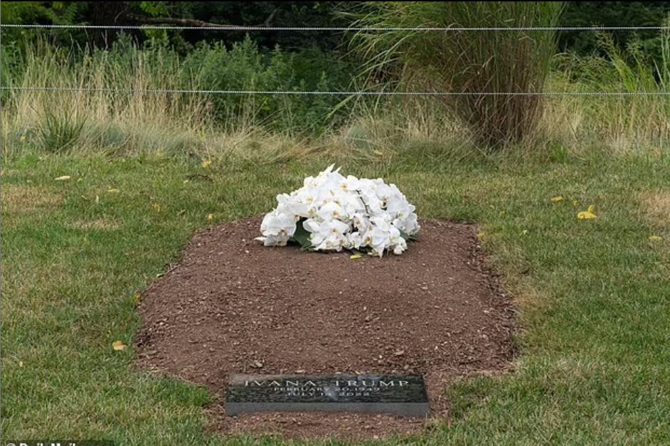 Ivana Trump is buried under a modest headstone at Donald Trump’s golf course in Bedminster, New Jersey, near the first hole, 1300 yards from the graves of 97 Black Civil War soldiers, a juxtaposition that has not gone unnoticed. New Jersey is the only state north of the Mason-Dixon line to have enslaved Black Americans prior to the Civil War. However, Ivana’s presence along the par 5 likely has more to do with tax avoidance than any kind of honor or “in memoriam.” Because, according to the New Jersey state tax code, any land used as a cemetery is exempt from most taxes, including real estate. Bedminster also receives a “farmland” tax break, saving Trump’s golf course a quarter-million dollars a year.