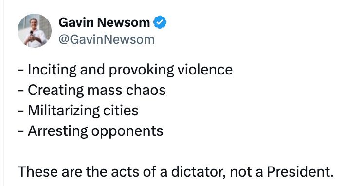 LA is not a police state. Let local government decide what to do. 47 didn’t even call national guard in on his insurrection. Is he scared now? Whinny titty baby.