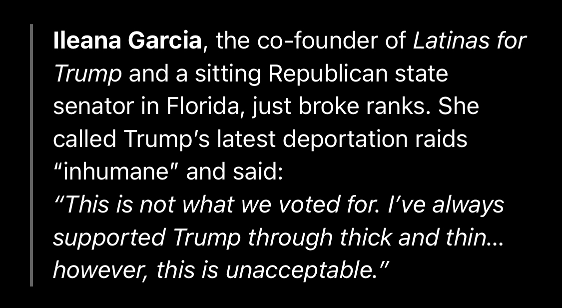 - Ileana Garcia, Florida st. senator and co‑founder of Latinas for Trump (I guess she slept thru his speech in 2015 about Mexicans here being “criminals and “racists”) broke with the Trump this weekend—describing the LA immigration arrests and use of federal troops as “unacceptable and inhumane.” She emphasized that due process is non‑negotiable, even under a Trump administration
