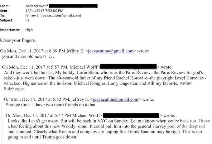 “This GoFundMe page is not only meant to help pay these legal costs but to fund the opportunity for all of us to see behind the dark curtain of the Epstein affair. I hope you’ll help support this effort. Thank you.” - Michael Wolff