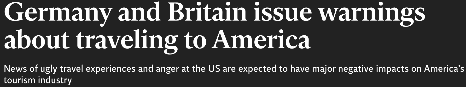 I guess Trump hasn’t destroyed enough segments of our economy yet, so we’re going for tourism! A Brit, Rebecca Burke, was traveling through the U.S., chronicling her trip on Instagram, when told by U.S. officials she didn’t have the right visa to enter Canada from the U.S. So she was prevented from entering Canada. But she ALSO wasn’t allowed back in the U.S., instead detained by ICE for NINETEEN DAYS. Her father claimed she was chained like “Hannibal Lecter.” F-ing brilliant humanity & PR, Trump! Now we have the inevitable result: