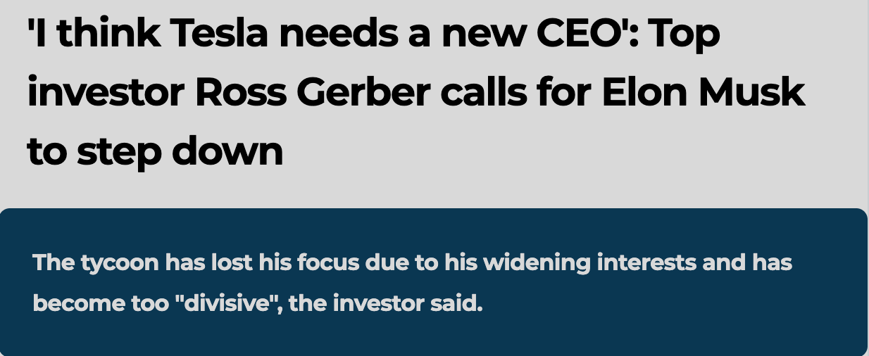 Meanwhile, Tesla stock’s circling the drain—down over 50% since mid-December at today’s open and boycotted the world over—his cybertrucks are being recalled—ALL—& his top Tesla investor just publicly told him to step down as CEO lest he continue to light the company on fire with the late-stage Howard Hughes + Pol Pot performance art.