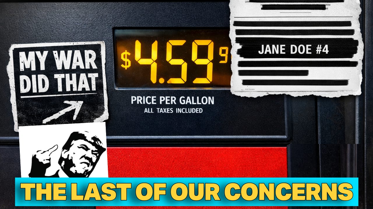 Gas prices have spiked 71 cents since Trump’s war with Iran began, and Americans are slapping stickers on gas pumps from coast to coast — “My war did that,” “You voted for this,” and worse. Meanwhile, the administration says hurting consumers is “the last of our concerns,” Saudi Arabia is warning of $180-a-barrel oil, and Speaker Johnson is assuring everyone the mission is “winding down” while Trump weighs deploying troops to the Strait of Hormuz. Oh, and Pete Hegseth wants you to pray about it.