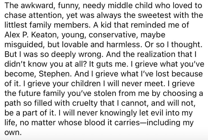 Over the past few days, a July Facebook post resurfaced in which Stephen Miller’s cousin, Alisa Kasmer—who hails from the non-goose-stepping wing of the Miller family—disowned him.