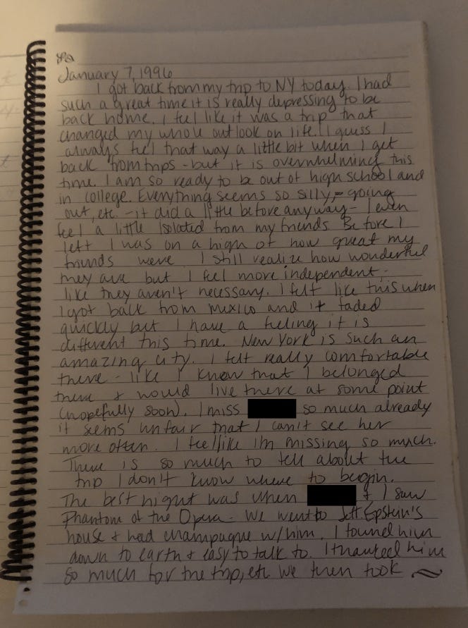 “I got back from my trip to NY today. I had such a great time it is really depressing to be back home. I feel like it was a trip that changed my whole outlook on life. I guess I always feel that way a little bit when I get back from trips - but it is overwhelming this time. I am so ready to be out of high school and in college. Everything seems to silly, - going out, etc - it did a little before anyway - I even feel a little isolated from my friends. Before I left I was on a high of how great my friends were. I still realize how wonderful they are but I feel more independent, like they aren’t necessary. I felt like this when I got back from Mexico and it faded quickly but I have a feeling it is different this time. New York is such an amazing city. I felt really comfortable there - like I know that I belonged there and would live there at some point hopefully soon. I miss [MARIA] so much already it seems unfair that I can’t see her more often. I feel like I’m missing so much. There is so much to tell about the trip I don’t know where to begin. The best night was when [MARIA] and I saw Phantom of the Opera. We went to Jeff Epstein’s house and had champagne w/ him. I found him down to earth and easy to talk to. I thanked him so much for the trip, etc. We then took…”