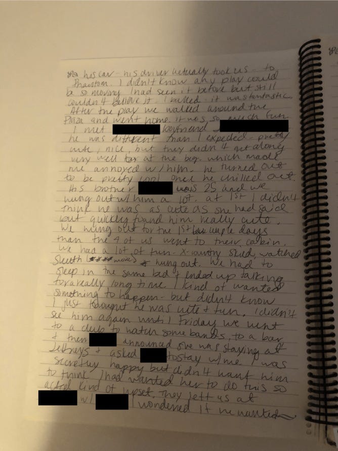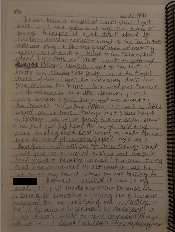 The following are Annie’s redacted journal entries from 1996, released by the DOJ on December 23, 2025. She and her sister Maria have given me permission to name them in these entries.