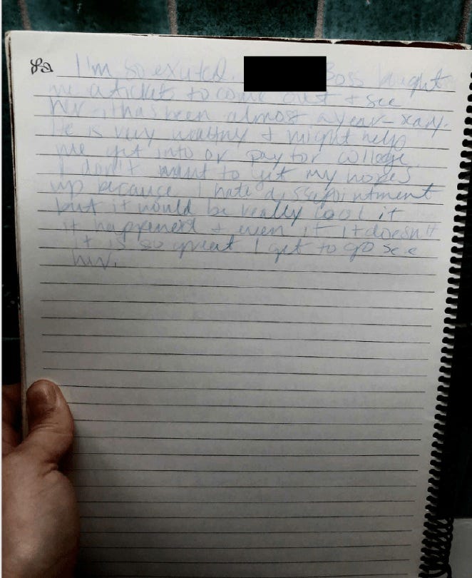“I’m so excited. [MARIA’S] Boss bought me a ticket to come out and see her. it has been almost a year - scary. He is very wealthy and might help me get into or pay for college. I don’t want to get my hopes up because I hate dissapointment [sic] but it would be really cool if it happened and even if it doesn’t it is so great I get to go see her.”