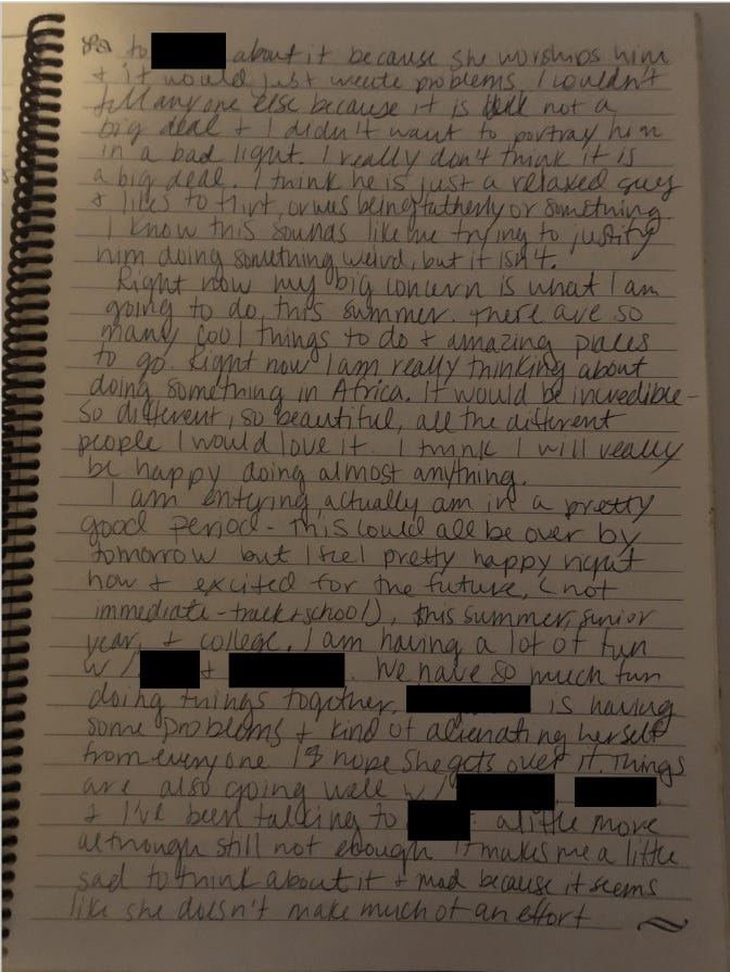 “…to [REDACTED] about it because she worships him and it would just create problems. I couldn’t tell anyone else because it is not a big deal and I didn’t want to portray him in a bad light. I really don’t think it is a big deal. I think he is just a relaxed guy and likes to flirt,, or was being fatherly or something. I know this sounds like me trying to justify him doing something weird but it isn’t. Right now my big concern is what I am going to do this summer. There are so many cool things to do and amazing places to go. Right now I am really thinking about doing something in Africa. It would be incredible - so different, so beautiful, all the different people I would love it. I think I will really be happy doing almost anything. I am entering, actually am in a pretty good period. This could all be over by tomorrow but I feel pretty happy right now and excited for the future, (not immediate - track and school), this summer, senior year, and college. I am having a lot of fun w/ [REDACTED] and [REDACTED]. We have so much fun doing things together. [MARIA] is having some problems and kind of alienating herself from everyone. I hope she gets over it. Things are also going well w/ [REDACTED]. [REDACTED] and I’ve been talking to [REDACTED] a little more although still not enough. It makes me a little sad to think about it and mad because it seems like she doesn’t make much of an effort.”