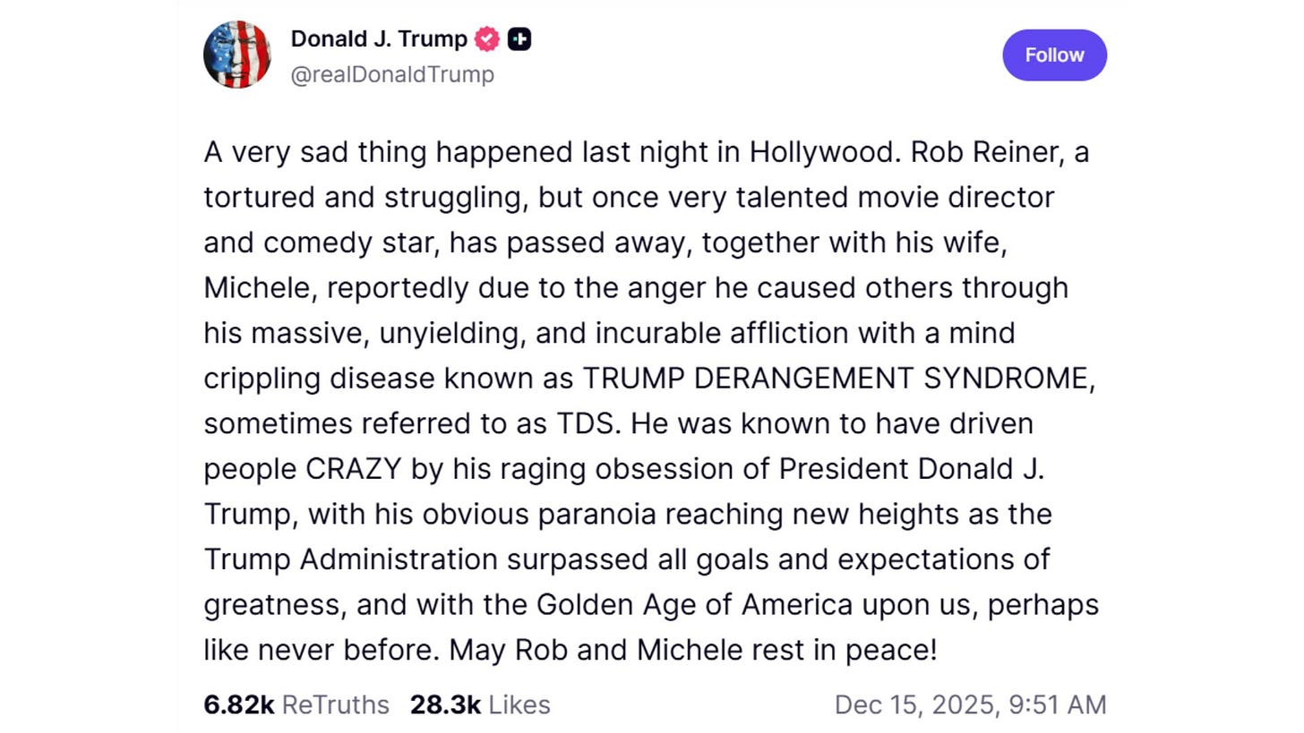 Trump wrote: “A very sad thing happened last night in Hollywood. Rob Reiner, a tortured and struggling, but once very talented movie director and comedy star, has passed away, together with his wife, Michele, reportedly due to the anger he caused others through his massive, unyielding, and incurable affliction with a mind crippling disease known as TRUMP DERANGEMENT SYNDROME, sometimes referred to as TDS. He was known to have driven people CRAZY by his raging obsession of President Donald J. Trump, with his obvious paranoia reaching new heights as the Trump Administration surpassed all goals and expectations of greatness, and with the Golden Age of America upon us, perhaps like never before. May Rob and Michele rest in peace!”