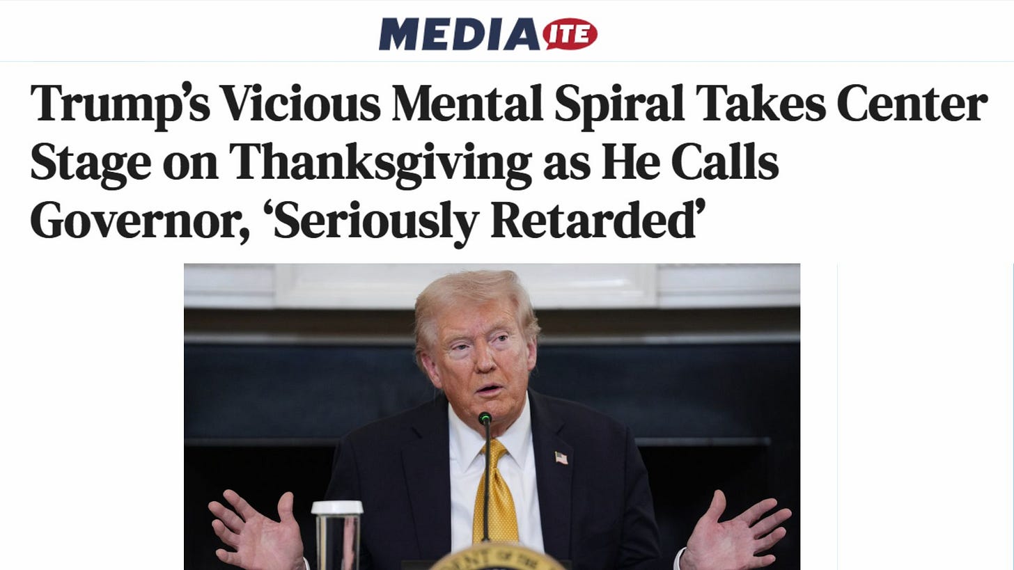 In a Thanksgiving post on social media, Trump called a sitting governor “seriously retarded,” a phrase rancid with cruelty and long rejected by civilized society.
