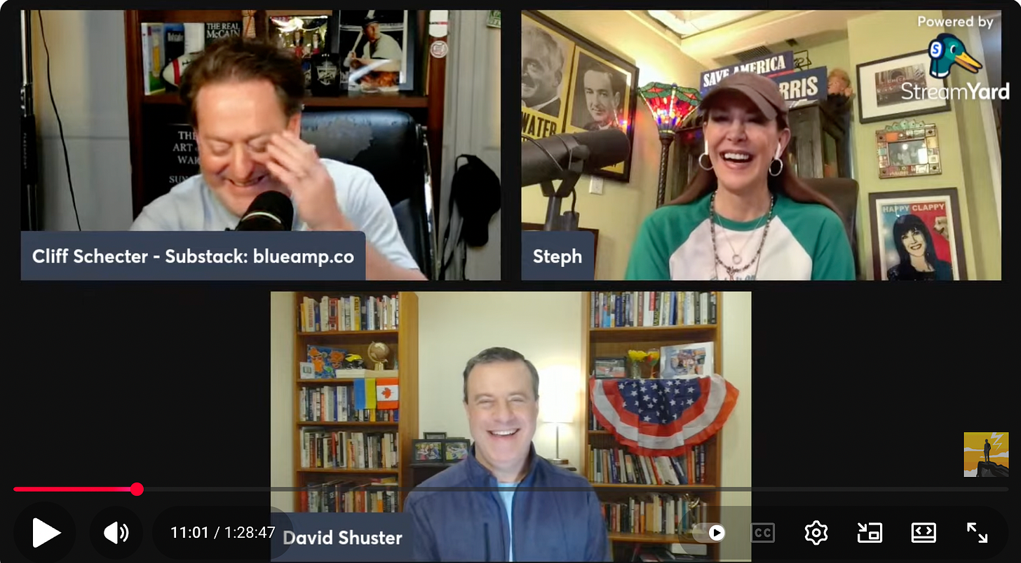 Seven minutes of not-Heaven later, Stephanie appeared, David Schuster popped in, and suddenly we had an Emmy winner, a liberal radio legend, and Cliff making self deprecating jokes.