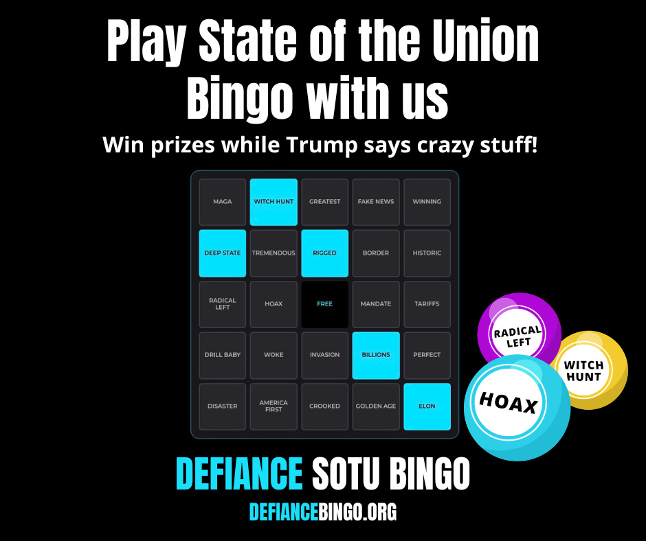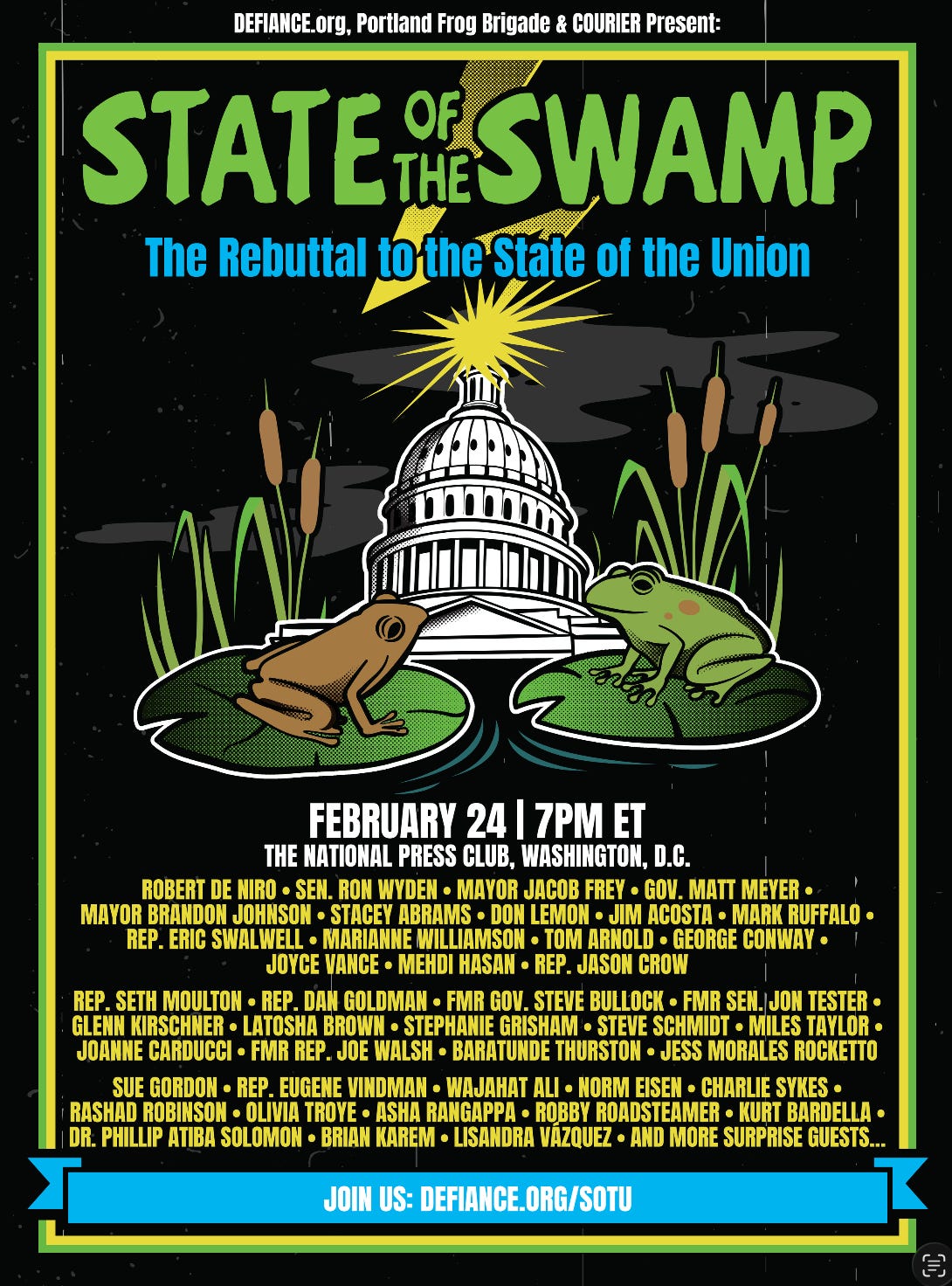 Instead of sitting through another Trump State of the Union spectacle, we’re coming together for State of the Swamp, a live pro-democracy rebuttal hosted by Defiance.org at the National Press Club in Washington, D.C., streaming tonight February 24 at 7 p.m. ET.