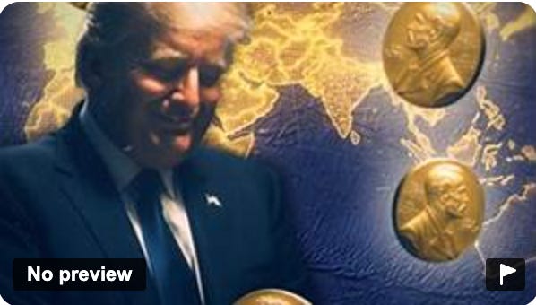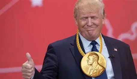 The comical-yet-pitiful result is that he and his entire staff just won’t stop begging for a Nobel Prize for The Great Man. Especially, busy caretaker for her elderly husband, Karoline Leavitt. Also quite vocal on this, Trump’s nomination gift of spare parts from Peter Thiel known as J.D. Vance.