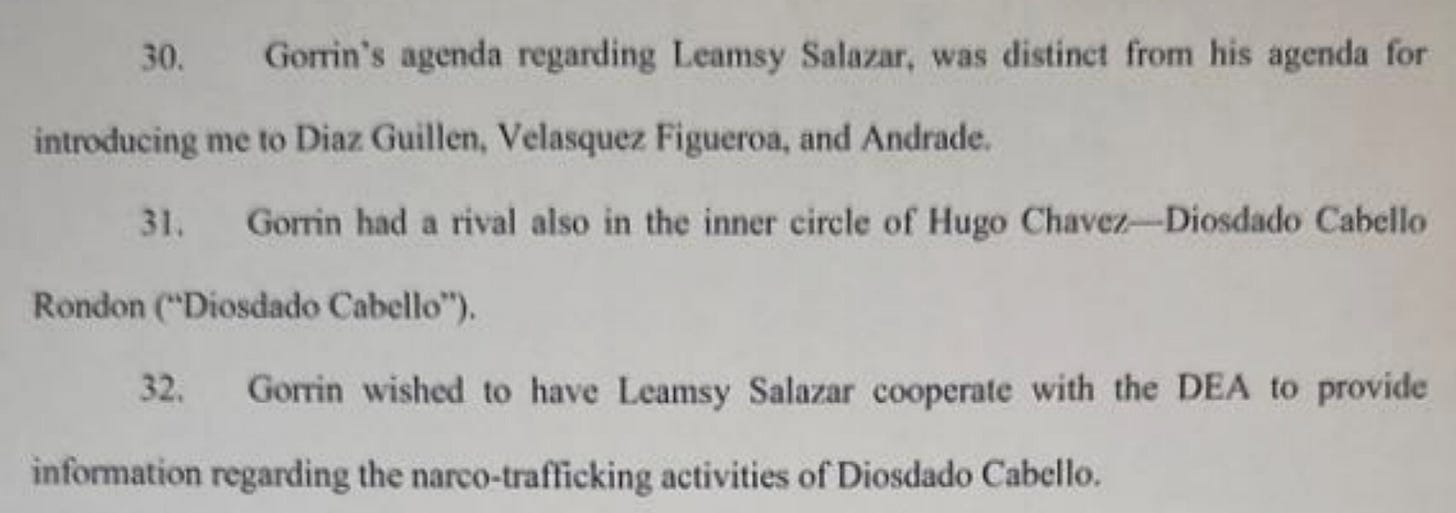 “Gorrin wanted to know if I could work with Leamsy Salazar regarding potential cooperation with the DEA. … Gorrin wished to have Leamsy Salazar cooperate with the DEA to provide information regarding the narco-trafficking activities of Diosdado Cabello.”