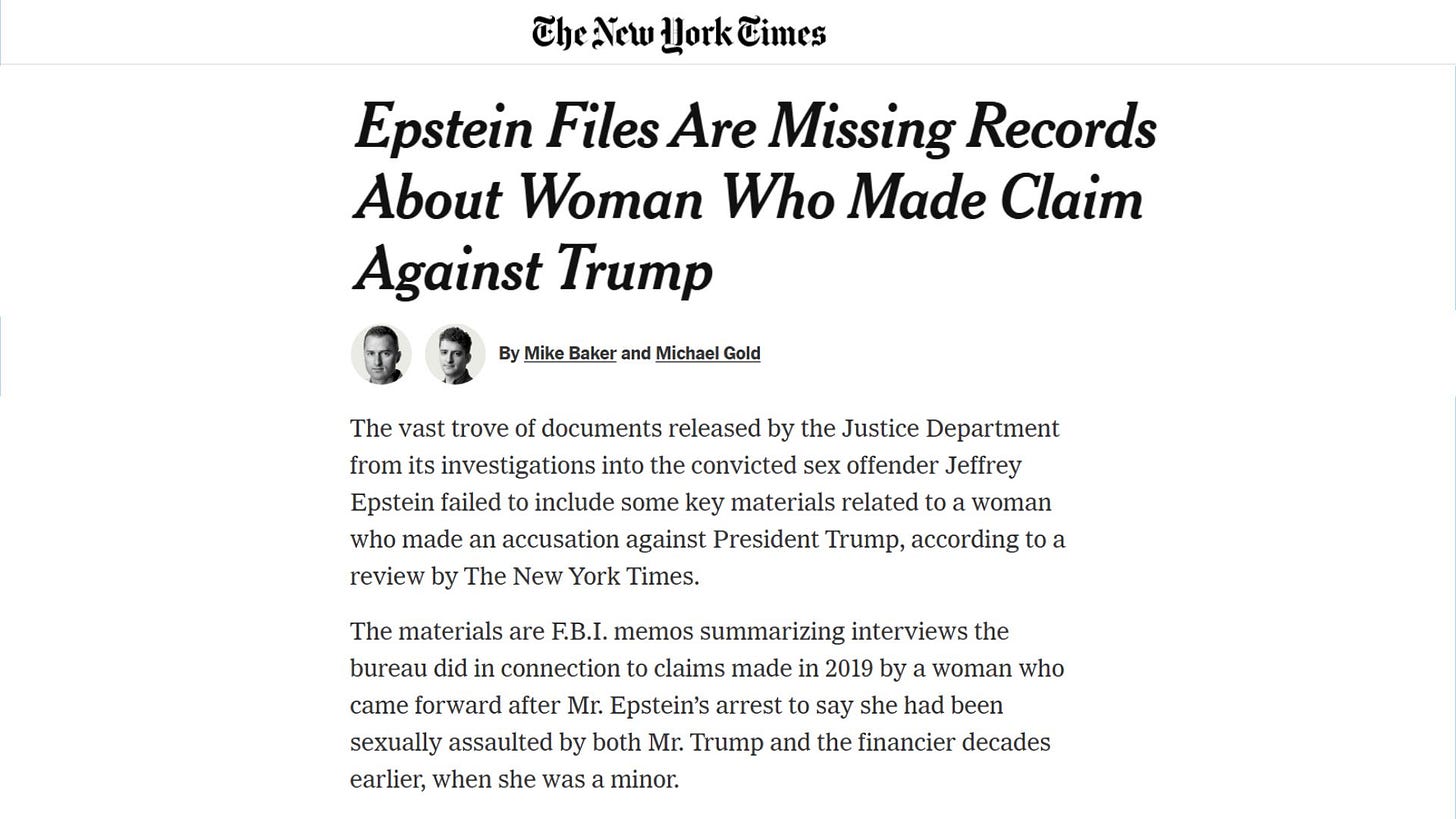 The Times reporting is simple and devastating: key materials tied to the rape allegation against Donald Trump were not included in the DOJ’s Epstein document release.