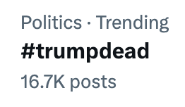 Twitter’s owned by a Trump clone from 30 years ago who lets Nazis cruise around the platform like it’s 1938 Sudetenland. And even there among Trump’s pals, the belief that Trump had shuffled off this mortal coil was such that this has been trending on and off the last 48 hours: