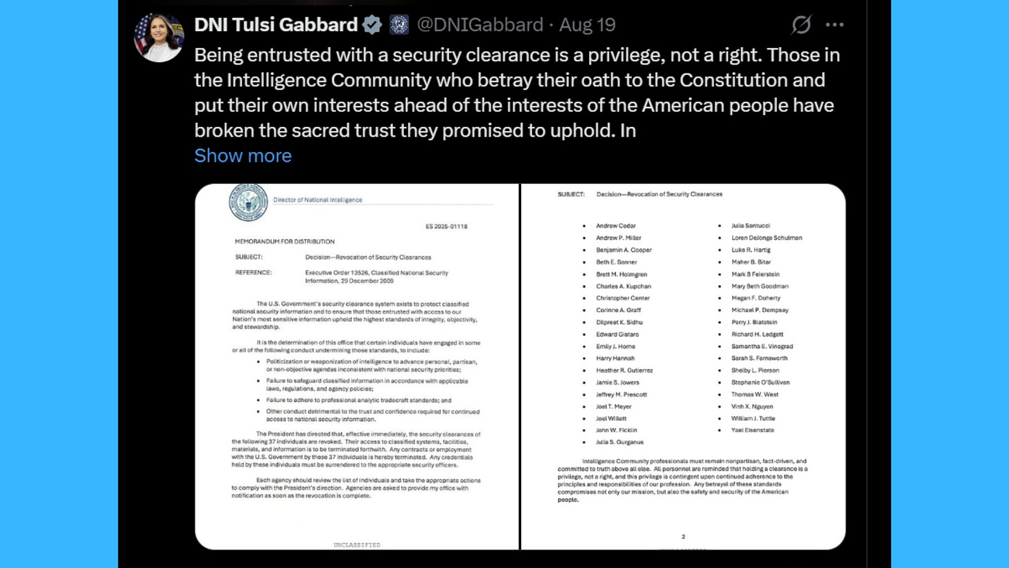 And for this, Gabbard fired them and took away their clearances. Yet, in her zeal to conduct this purge, Gabbard failed to consult the CIA. She simply published the list on social media—with no vetting, no warning, and no regard for human lives or the national interest.
