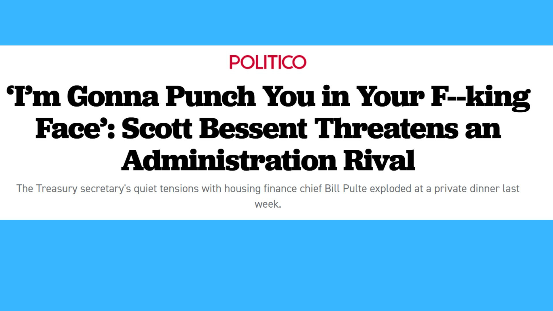 As first reported by Politico, our nation was treated—if one can call it that—to the spectacle of Treasury Secretary Scott Bessent threatening to beat the living hell out of Bill Pulte, Trump’s scrawny housing regulator.