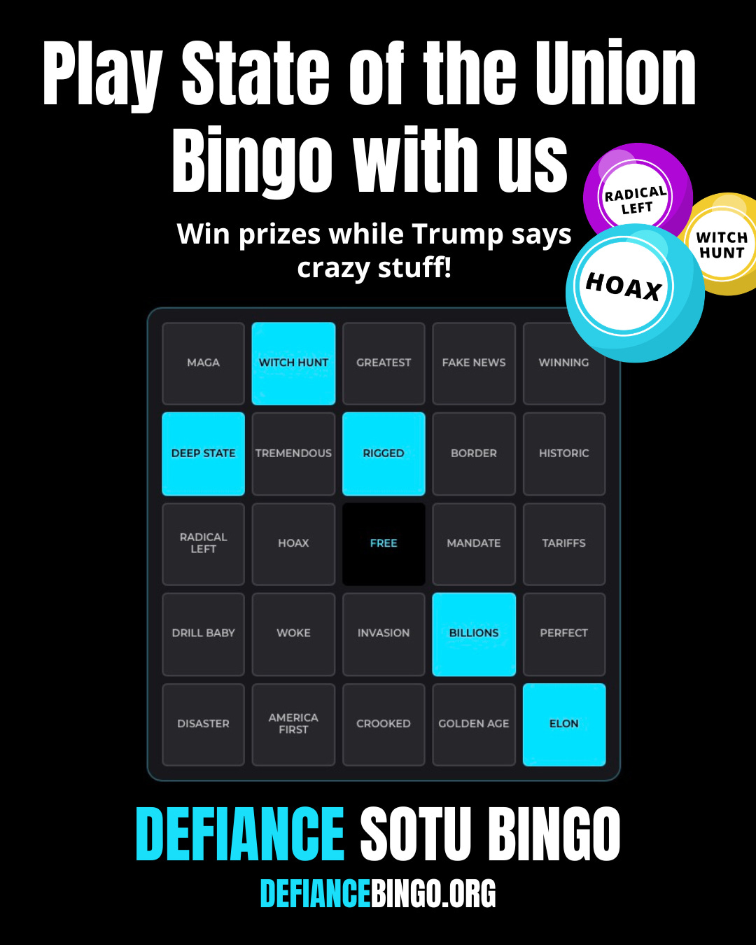 This isn’t some sleepy panel discussion. We’ve got a stacked lineup, live music, satire, yes—frog costumes (don’t ask, just show up), and movement leaders and public figures delivering sharp, unapologetic commentary while Trump does his thing across town. You can even play SOTU Bingo during the livestream—because if we’re going to endure this circus, we might as well score it.