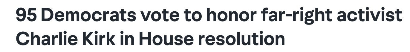 They blithely gave into this vote and the GOP’s fake framing of Kirk’s life. Without so much as a demand that for their votes the day of remembrance include schoolchildren slaughtered in their classrooms (because Republicans love guns more than kids).